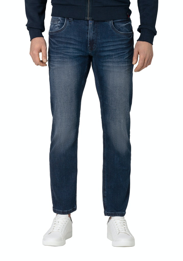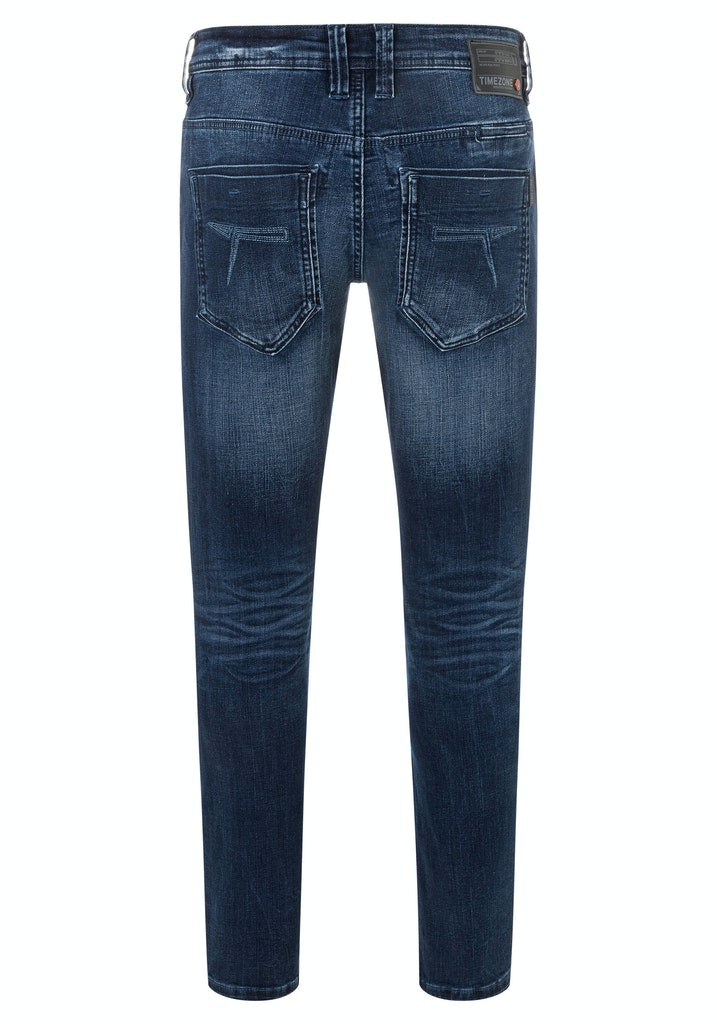 Herren Jeans mit Mustache-Falten von TIMEZONE *Medium Waist Hose *Regular Fit mit Slim Legs *Bund mit Knopf, Reißverschluss und Gürtelschlaufen *5-Pocket-Stil mit kleiner Coin Pocket *Logo-Patch am hinteren Bund *Aus weichem Baumwoll-Stretch mit hellen Waschungen *In Light Royal Wash